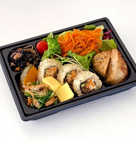カロリーを気にしながらも満足感を得たい方へ。プチプチとした食感の玄米ロールに、つくねや色とりどりの焼き野菜などを組み合わせました。サラダや和え物、焼き物など、さまざまな味わいが愉しめます。